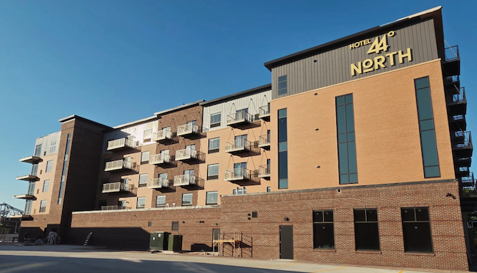 The new five-story development is located downtown behind the Winona 7 Cinema. The building includes 76 hotel rooms on the east side of the building and 24 apartments, Flats at 44 North, on the west side. It also includes a pool, hot tub, sauna, fitness center, meeting rooms, a bar, a parking garage for tenants, and a patio with grills.