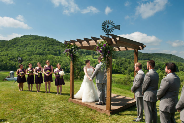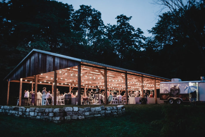 The barn is 30’ x 60’- This holds about 150 people seated for dinner; more for a ceremony or dance setting. New in 2017 is a beautifully constructed pavilion, located adjacent to the barn, that is 40’ x 80’, with seating up to 300 people. We also have the beautiful hilltop ceremony site!